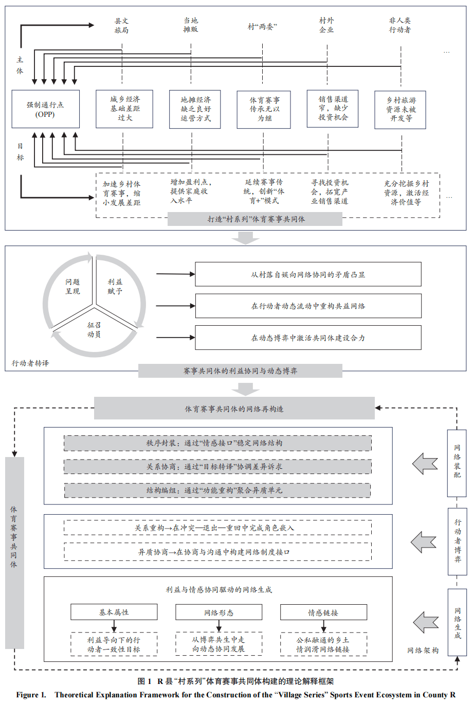 利益赋予的核心在于依托强制通行点对各利益单元进行合理分配,而强制通行点是解决各异质行动者障碍的措施,核心行动者将自身的利益同化为网络中各类异质行动者的共同利益,从而形成稳固网络(李伟 等, 2019)。在本案例中,R县“村系列”体育赛事共同体的建构并非事先设计、一次到位的静态建制,而是一个不断吸纳、排斥、调适与再协商的动态过程网络。核心行动者通过将自身诉求与异质行动者的利益目标进行整合协调,使网络内各节点在实现局部目标的同时亦共同指向网络中心设定的行动逻辑,通过功能重构将各异质单元装配进网络之中,构筑具有聚合力的共益网络,形成相互依存的赛事共同体。